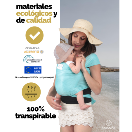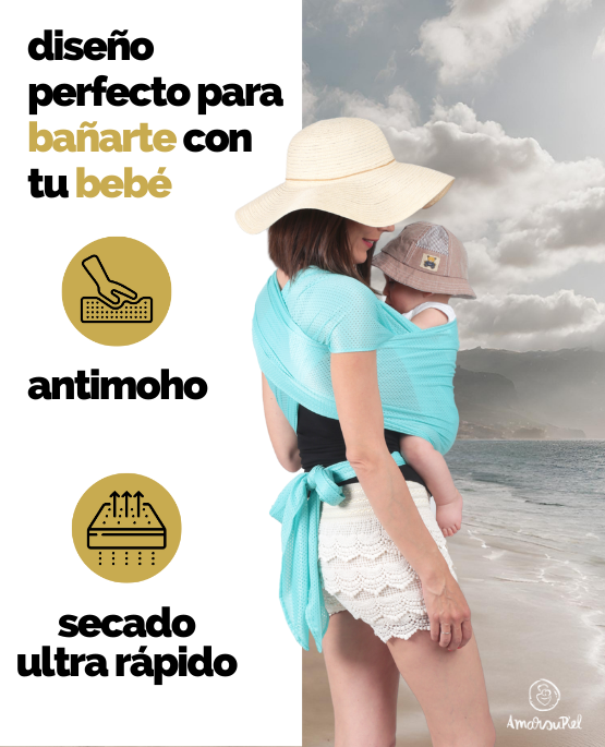 Dank seiner Eigenschaften ist es perfekt, um den Strand, das Schwimmbad oder Wasserparks mit deinem Baby zu genießen. Richtig gebunden ist es ein ergonomisches Tragetuch für Neugeborene und für Babys bis zu 15 Kilo. Es ist ein hervorragendes Beispiel für ein Wassertragetuch, das speziell für die wärmsten Monate entwickelt wurde.