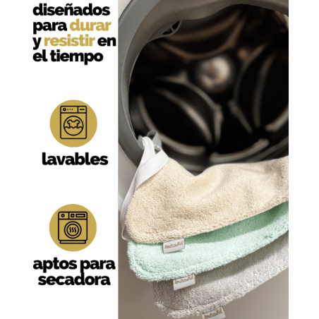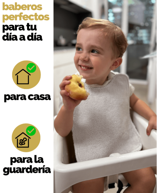 Sin duda, los más prácticos son los baberos con goma. Después de mucha búsqueda, encontramos un tejido fuerte y suave a la vez, con un gramaje adecuado: el tejido de rizo de alta calidad con el que están confeccionados nuestros baberos.