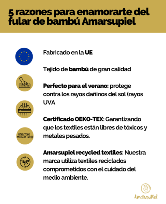 Además, su tejido de bambú aísla a tu bebé de los rayos UVA, los rayos dañinos del sol. Con el fular de bambú de Amarsupiel disfrutaréis de un porteo cómodo y seguro para tu bebé durante las vacaciones de verano. Mientras que su tejido ligero y 100% transpirable no os hará pasar calor.