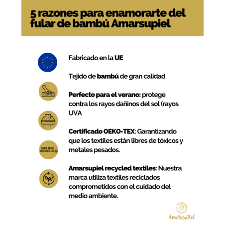 El fular portabebés Amarsupiel de bambú está fabricado íntegramente en España y la Unión Europea. Apto desde del nacimiento, (recien nacido desde los 2,5 kg hasta los 7kg).