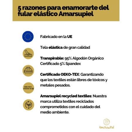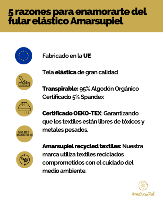 Nuestro fular elástico portabebés está fabricado en España y exclusivamente producido para Amarsupiel. Su textil cuenta con la certificación Oekotex, que garantiza que el tejido del fular está libre de tóxicos y metales pesados. Nuestra prioridad es la comodidad, pero también la pureza y la sostenibilidad de nuestros productos tanto para el bebé como para el medio ambiente.