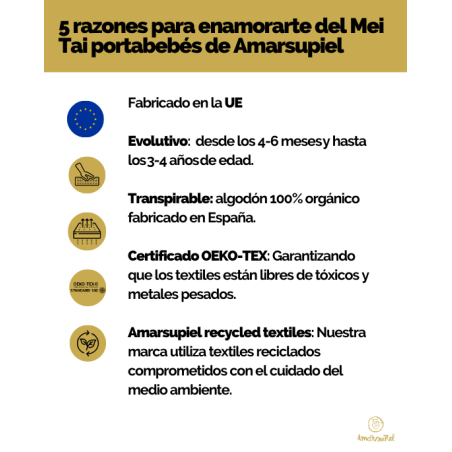 El mei tai de Amarsupiel está confeccionado en España con tejido de algodón orgánico de alta resistencia certificado. Ofrece una gran comodidad también para el bebé en sus zonas acolchadas en el área de apoyo de las corvas. También cuenta con una capucha ajustable para proteger al bebé de la lluvia y el sol.