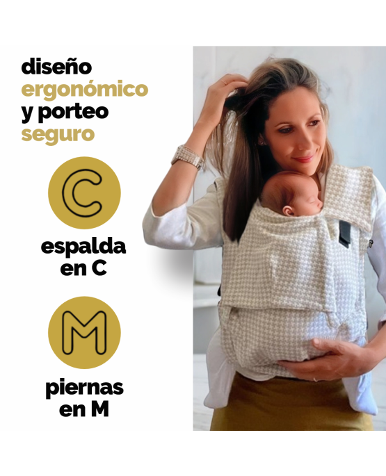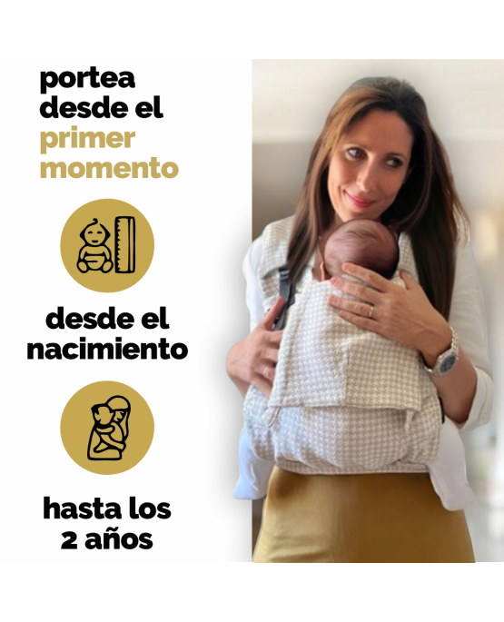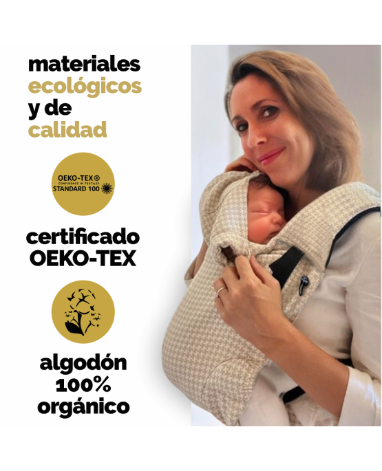 Fabricada con los más altos estándares de calidad en España, nuestra mochila está disponible en otros tonos neutros, en estampados “pata de gallo” 100% Jacquard originales y elegantes, asegurando una combinación perfecta con cualquier outfit y garantizando una experiencia de porteo cómoda y segura para padres y bebés por igual.