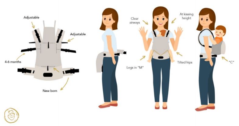 El portabebés debe sujetar de corva a corva, evitando descansar el peso sobre sus genitales.